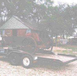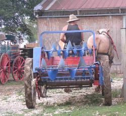 | A parts spreader Paul found full of dirt acting as a planter at a farm not too farm from our own farm. The owner wanted to get rid of it and was willing to take $100 for it. (Paul offered not to charge them for digging out all the dirt and hauling it away for them.) All agreed that 4 rare breed hens and a rooster plus 2 muscovy ducks was a fair trade all around. |
