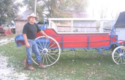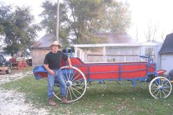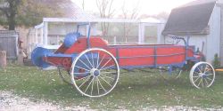 | Paul’s spreader fully reassembled with the steel wheels. Cyndi’s research provided the correct color scheme and Paul used IH red, Rustoleum Royal Blue and Rustoleum Almond. (see above for links to the specs) | |||